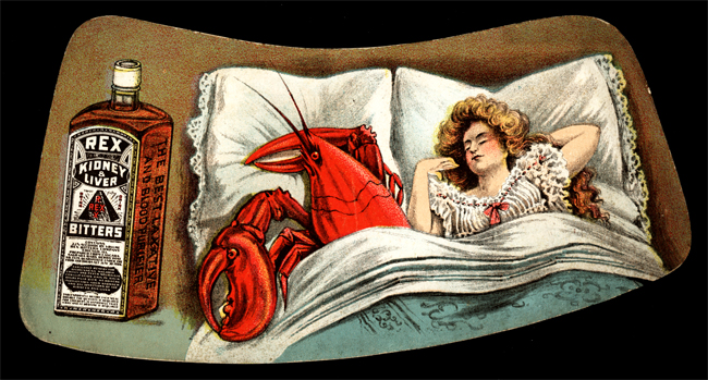 Lobster represents woman's constipated husband looking to Rex Bitters for relief.
