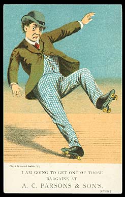1.11 Falling Man - One of a set of 14 stock trade cards produced by several printers showing roller skaters in comic situations, this example printed by Clay & Richmond, Buffalo, NY, imprinted for A. C. Parsons & Sons, R-adv promises "Different kinds of these cards will be given away at the Union Roller Rink every evening when open." |