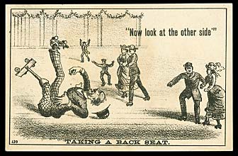 5.3 "Taking A Back Seat" - One of a set of at least 8 comic stock trade cards showing roller skaters and numbered 130 in the lower left corner, R-adv for Bermingham's Clothiers, Boston. R-adv for