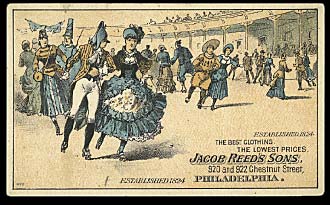6.2 One of a set of 6 stock trade cards showing people enjoying themselves in a roller skating rink and numbered 470 in the lower left corner, imprinted for Jacob Reed's Sons, Clothiers, Philadelphia.