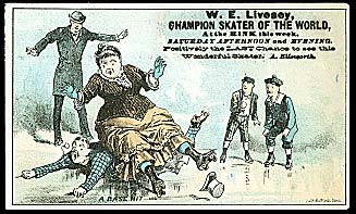 7.3 "A Base Hit" - One of a set of 6 comic stock cards showing roller skaters suffering accidents, printed by J. H. Bufford Sons, and imprinted for W. E. Livesey, Champion Skater Of The World.