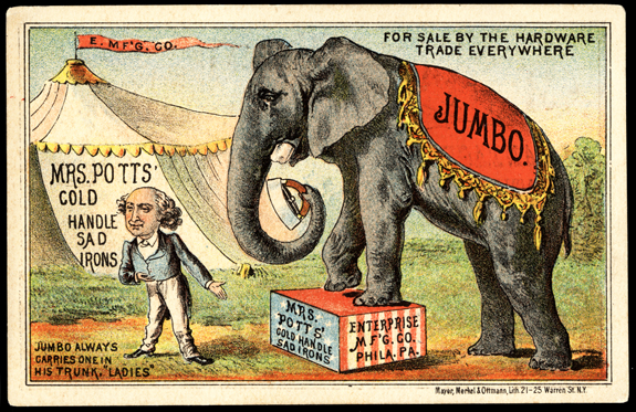 P. T. Barnum using his circus star Jumbo to sell Mrs. Potts' Sad Irons