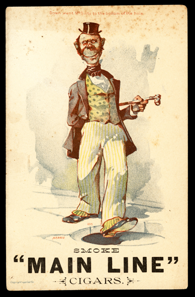 Depicts line from 1889 song "Down Went McGinty to the bottom of the hole"