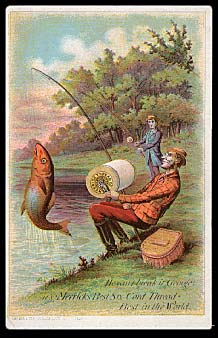 9 - Merrick's Six Cord Thread, used as a fishing line, captioned "He Won't Break It, George, It's Merrick's Best Six Cord Thread, Best In The World."