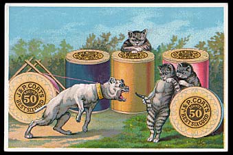 33 - J & P Coats' Best Six Cord Spool Cotton, cats taunt dog tied up with the thread.