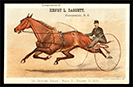 Charles Saul, Syracuse, NY - Racing Trotters. One of a set of 24 stock cards of the Strobridge Fair Cards set printed by the Strobridge Lith. Co. Cincinnati, Ohio showing scenes of state and county fairs and mostly sold to fair promoters, this card marked as Card 8, R-adv for this farm & garden merchant. F, tiny crease top edge, faint glue stains on reverse. |