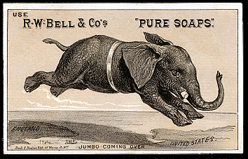 Jumbo Coming Over. One of the scarcest of the 12-card Jumbo series printed by Buek & Lindner, showing Jumbo going transcontinental from England to America, F, light corner mounting marks on blank reverse. Brought $81.00 as Lot 017.01 in Trade Card Place Auction 017 on 12/18/2000. |