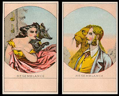 2 Resemblance Cards - Rat and Lion. Two of a set of at least 8 stock cards showing a somewhat sarcastic resemblance between a human and an animal. Both are F- with light glue traces on 4 corners of blank reverse. Brought $30.40 as Lot 098.02 in Trade Card Place Auction 099 on 6/10/2004. |