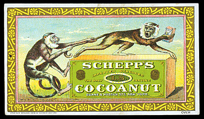 Schepp's Cocoanut - Tussling Monkeys. Great image on this colorful card printed by Geo. Schlegel, NYC, showing monkeys fighting over a package of the cocoanut, R-adv gives prices for various package sizes. F-, very light stain top margin. Brought $40.00 as Lot 127.06 in Trade Card Place Auction 127 on 2/9/2007. |