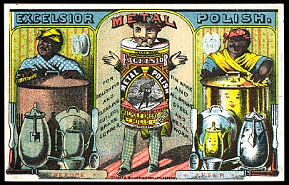 Excelsior Metal Polish, Great Before & After imagery of the improvements this polish can produce, with an anthropomorphic can pointing to the difference, printed by Schultz & Harrington, Lith. Boston. R-Adv has small b/w image of the product can and a price list. F, small no-harm scuff on reverse, front is VF Brought $37.00 in Trade Card Place Auction 048 on 3/27/02. |