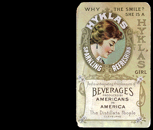 Hyklas Ginger Ale, Scarce mechanical foldover card in which the woman raises a glass of Hyklas to her lips when the card is opened (watch animation), R-adv other Hyklas beverages. G+, wear, rounded corners, partial fold separation. Brought $20 in Trade Card Place Auction 032 on 7/11/01. |
