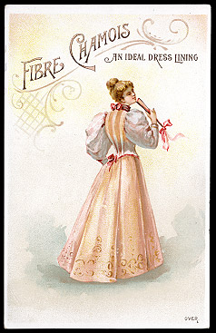 Fibre Chamois. One of a set of cards advertising Fibre Chamois which, according to the R-adv, provides superior support for "puffed sleeves" and "Paquin" skirts. F. Brought $14 in Trade Card Place Auction 015 on 11/8/00.