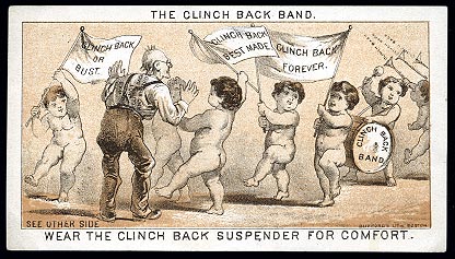 Clinch Back Suspenders. Man wearing busted suspenders, which are not Clinch Back, being serenaded by the Clinch Back Baby Band, R-adv shows small b/w image of the suspenders. F, light creases UL and LL corners. Brought $10.83 in Trade Card Place Auction 031 on 6/27/01. |