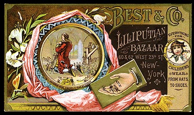 Best & Co. Liliputian Bazaar. Beautiful card showing Gulliver and the Liliputians in one inset, his hand in a second, and a diecut trade card for the Liliputian Bazaar in a third, R-adv lists many types of clothing offered as holiday presents for children. F, small album scuff on reverse affecting one word of text. Brought $30 in Trade Card Place Auction 031 on 6/27/01. |