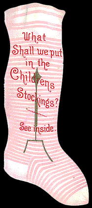 Stern Bro's Christmas Stocking. Diecut foldover Christmas stocking, inside lists clothing and accessories sold by Stern Brothers, NYC, as gifts for children, gentlemen, and ladies, shown at 80 percent of actual size, R-adv (watch animation). VG, couple of small album remnants on reverse, paper clip indentation at top. Brought $14 in Trade Card Place Auction 036 on 9/5/01. |