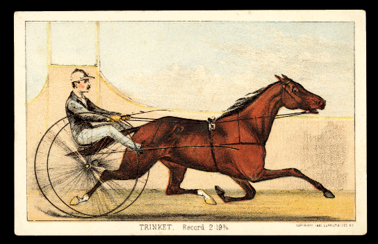 Currier & Ives - Trinket, Record 2:19-3/4, One of a set of 26 C&I trotter cards listed in Ron Schieber's "Currier & Ives Trade Card Check List," copyright 1881, Currier & Ives, NY, R-adv (animated) for the Spring Trotting Meeting in Kenosha, Wisconsin, May 23-25, 1882. F. Brought $100.00 in Trade Card Place Auction 168 on 11/26/10. |