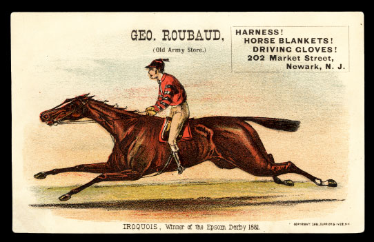 Currier & Ives - Iroquois, Winner of the Epson Derby 1881, One of a set of 10 C&I thoroughbred cards listed in Ron Schieber's "Currier & Ives Trade Card Check List," copyright 1881 by Currier & Ives, NY. F-, album mounting scuff on 2 corners of blank reverse. Brought $100.00 in Trade Card Place Auction 180 on 2/27/12. |
