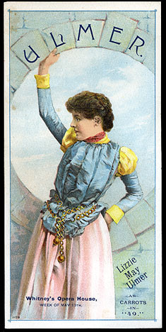 Lizzie May Ulmer, Victorian actress as she appeared as Carrots in the play '49, large card shown here at 70 percent of actual size. VG, barely noticeable crease across card through her hair. Brought $23.75 in Trade Card Place Auction 031 on 6/20/01.
