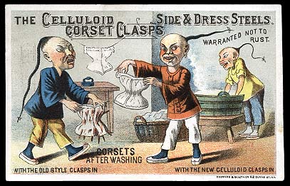 Celluloid Corset Clasps. Great ethnic trade card with a with & without theme showing the benefits of using the new Celluloid Corset Clasps. R-adv lists 6 reasons why the product is superior. VG, small crease LR corner, light warping. Brought $26 in Trade Card Place Auction 010 on 6/29/00. |