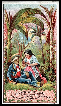 Ayer's Ague Cure. Woman offering cure to ailing man, R-adv claims the medicine is a certain cure for all malarial disorders. F. Brought $10 in Trade Card Place Auction 022 on 2/14/01.