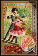 Trade cards in this category consist of pages which are folded shut and are opened to show additional text or illustrations. Most of these cards have a front, back and two inside pages, but some have more pages and unfold accordian style. This category should not be confused with metamorphic trade cards which also employ folding parts, or foldout trade cards that consist of a single piece that is normally folded closed and have multiple folds that unfold (fold out) to form a much larger card that is usually square. Some