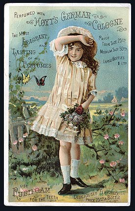Hoyt's German Cologne & Rubifoam for the Teeth, Pretty little girl with butterflies and flowers, R-adv both products. VG, corner and edge creases. Brought $10 in Trade Card Place Auction 014 on 10/25/00.