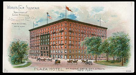 Plaza Hotel, New York City - World's Fair Souvenir, This card was distributed at the 1893 Columbian Exposition by the Ottmann Lith. Co. as an example of their color printing, R-adv describes the Plaza Hotel in great detail. VG, a hard-to-see horizontal crease across the center of the card from the hotel's left edge to the card's right edge. Brought $12.00 in Trade Card Place Auction 100 on 7/14/2004. |