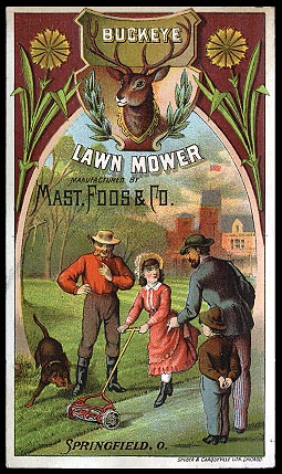 Buckeye Lawn Mower, Young girl demonstrating how easy it is to use the lawn mower, R-adv other Buckeye products and lists 9 different sizes of lawn mowers. F. Brought $39.77 in Trade Card Place Auction 029 on 5/23/01.