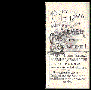 | Tetlow's Gossamer Powder - The General, Mechanical. Little girl raises her arm to powder the general's face when the card is opened (watch animation), patented 1892. F. Brought $25.00 as Lot 087.26 in Trade Card Place Auction 087 on 11/20/03. |
