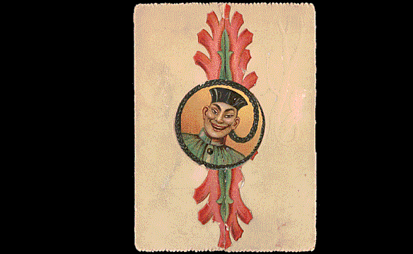 | Chinese Man and Monkey, Mechanical. Clever card that opens (watch animation) to show a monkey pulling a Chinese man's queue, monkey and man are embossed and top and bottom edges of the card are serrated, card is 8 x 5 inches when opened. VG+, light wear, monkey's wrist has been repaired. Brought $25.00 as Lot 104.29 in Trade Card Place Auction 104 on 11/29/04. |