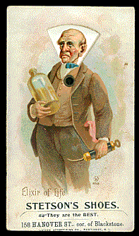 | Elixir of Life - Changing Heads Mechanical. Stock card imprinted for Stetson's Shoes with an attached circular disk that revolves to show the man's head at 6 stages of life from elderly to baby after he takes the Elixir of Life (watch animation for 2). F-, light wear. Brought $25.00 as Lot 118.40 in Trade Card Place Auction 118 on 3/23/06. |