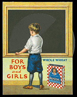| Ralston Whole Wheat Cereal - Boy At Blackboard, Mechanical. He writes "Ralston - Health" and then erases it (animated) as the disk at right edge is rotated, R-adv shows a colored cross section of a grain of wheat pointing out its contents of calcium, phosphorous, proteins, iron, carbohydrates, and vitamins. VF. Brought $34.00 as Lot 136.49 in Trade Card Place Auction 136 on 11/19/07. |