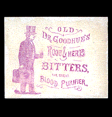 Old Dr. Goodhue's Root & Herb Bitters. This bitters is listed in Ring's "For Bitters Only" as being advertised during the 1870s. Animated here to show the reverse advertising the Good Samaritan's Immediate Relief, woodblock printed. F. Brought $35 in Trade Card Place Auction 014 on 10/25/00. |