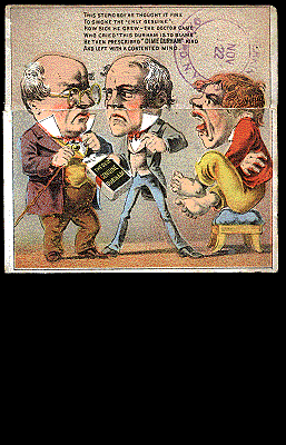 Dime Durham Smoking Tobacco - Sick Boy. Very scarce before & after metamorphic (watch animation) showing boy sickened by smoking a Durham imitation and then cured by smoking Dime Durham. VG, postmark UR corner (no trace of a stamp), and 3 spots of album residue on reverse that will probably soak off. Brought $50.00 in Trade Card Place Auction 030 on 06/06/2001. |