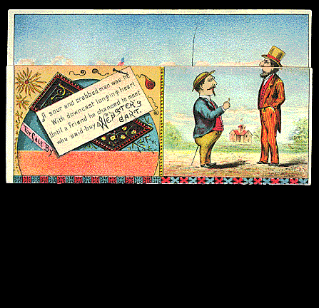Webster’s Cart Metamorphic. Sour and crabbed man gets happy after buying a Webster Cart (watch animation), VG, several scuffs on blank reverse, one of which can be seen from the front when holding the card up to a strong light but otherwise not noticeable, light crease LR corner. Brought $135.00 in Trade Card Place Auction 045 on 02/13/2002. |