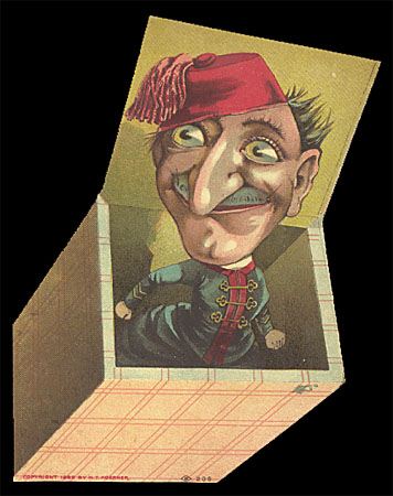 Jack-In-The-Box Metamorphic - Man with Fez. One of a set of four diecut metamorphic cards showing a man popping out of a box, shown here at 85 percent of actual size, copyright 1889 by H. T. Koerner, this card has never been folded so it’s not shown in animation. F. Brought $85.00 in Trade Card Place Auction 046 on 02/27/2002. |