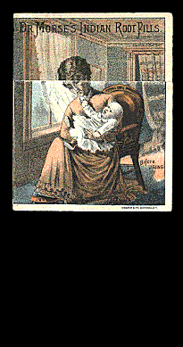 Dr. Morse’s Indian Root Pills - Mother & Child Metamorphic. Scarce card showing sick mother cured and playing with her baby after taking the pills (watch animation), R-adv. F-, on thin stock, printed slightly off center, tiny nick LR edge. Brought $30.00 in Trade Card Place Auction 047 on 03/13/2002. |