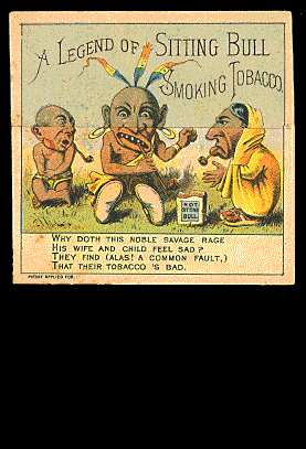 Sitting Bull Smoking Tobacco - Before & After Metamorphic. Scarce before & after card with 8-line verse telling how Indian family is savage and unhappy with bad tobacco and then (watch animation) civilized and overjoyed after switching to Sitting Bull, R-adv. VG+, light stains, slight crease UR edge, fold is intact. Brought $63.00 in Trade Card Place Auction 112 on 08/17/2005. |