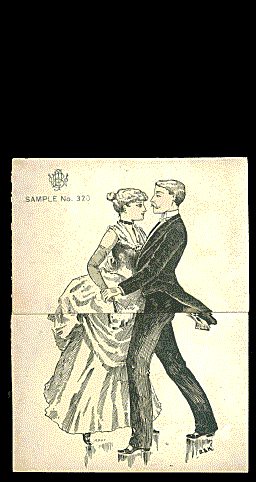 Dancing Couple - Metamorphic. Romantic dance turns bad when card is opened (watch animation), a sample card for a company whose monogram is in the UL corner, card has a small tab in the middle that was probably used to hold a business card. VG+, 1" partial fold separation reinforced by nearly invisible archival tape. Brought $31.00 in Trade Card Place Auction 115 on 11/16/2005. |