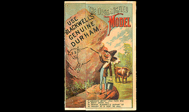 Blackwell's Tobacco - Dissatisfied Model Metamorphic. Scarce card that unfolds once (watch animation) to show the bull viewing the artist's rather poor painting of him and then unfolds again (2nd animation) to show how the bull expressed his dissatisfaction. VG, light wear and toning, small corner crease, 1" separation on one fold and 1/4" separation on the other, both reinforced with nearly invisible archival tape. Brought $70.00 in Trade Card Place Auction 116 on 01/18/2006. |