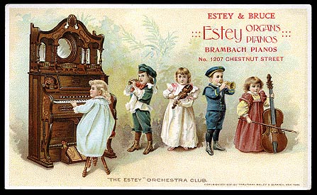Estey Orchestra Club, Child orchestra accompanied by an Estey Organ, R-adv has b/w image of the Estey Organ Works in Brattleboro, VT. F, a few small scuffs on reverse. Brought $27.00 in Trade Card Place Auction 016 on 11/22/00.