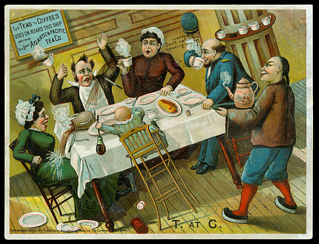 | Atlantic & Pacific Tea Co. - Tea at Sea. Dynamic image of a captain's cabin during a storm at sea with the captain calmly drinking his tea and saying "Don't catch me loosing my T" while his guests have completely lost theirs, 8-1/2 x 6-1/2 inches and copyrighted 1886, R-adv for Thea-Nectar Tea and Eight O'Clock Breakfast Coffee. VG, several front scuffs have been colored in, long crease LR corner has been pressed out. Brought $26.44 as Lot 143.20 in Trade Card Place Auction 143 on 7/21/2008. |