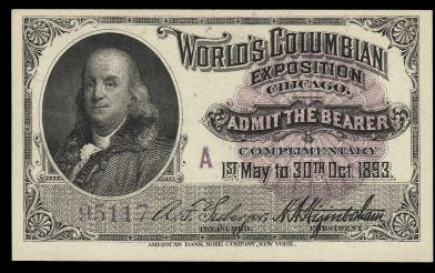 1893 Columbian Expo Souvenir Portrait Ticket - Franklin, A one-day admission ticket printed by the American Bank Note Co., NY, and issued after the initial series of 4, symbolizing Franklin's discovery of electricity which was a featured display of the Expo, next rarest of the 6 tickets, reverse (animated) in yellow. EX. For more information on this series of tickets Google on "Columbian Exposition Portrait Tickets." Brought $65.00 in Trade Card Place Auction 159 on 3/1/2010. |