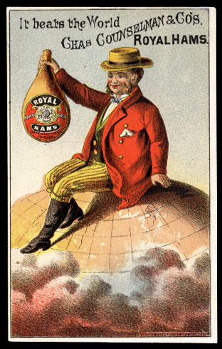 Counselman's Royal Hams - John Bull On Top Of The World, Dramatic portrayal of "Beating the World," printed by Shober & Carqueville, Chicago. F-, small bend UR corner, penciled names on blank reverse almost completely erased. Brought $12.00 in Trade Card Place Auction 194 on 7/6/2013. |