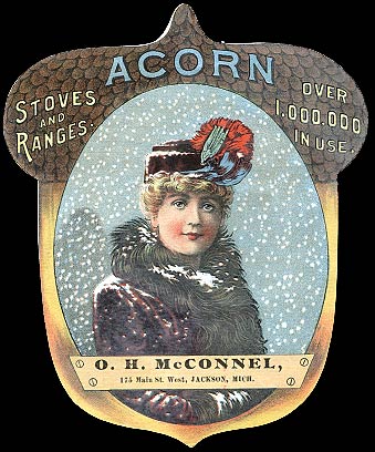 Acorn Stoves and Ranges. One of a set of acorn-shaped diecut cards advertising this product, R-adv shows a b/w image of the Black Acorn wood cooking stove. F-, several small spots of album residue on the reverse minimally affecting image & text. Brought $16.25 in Trade Card Place Auction 032 on 7/11/01. |