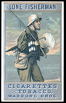 Lone Fisherman Cigarettes & Tobacco. Fisherman off for a day's fishing equipped with pole, fan, umbrella and camp stool. VF. Brought $45 in Trade Card Place Auction 020 on 1/17/01.