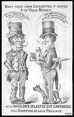 Whalen's Selected Cut Cavendish Tobacco. Rare with & without card where man at left can't afford good clothes because he pays 20 cents for 20 cigarettes, and man at right dresses well because he buys Whalen's Tobacco for 10 cents and makes 40 cigarettes using his cigarette roller, R-adv lists prices for 11 Whalen tobaccos. F. Brought $325 in Trade Card Place Auction 042 on 11/28/01. |