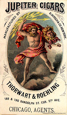 Jupiter Cigars, colorful inset of the Greek god, Rare and VF. Brought $475 in Victorian Images Auction 46 on 5/22/00.