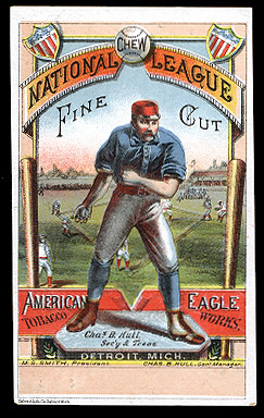 National League Fine Cut, classic baseball image, great visual harmony, great printing by Calvert. Bottom corners lightest wear, still Fine. Rare and very popular card. Brought $950 in Victorian Images Auction 48 on 8/23/00.